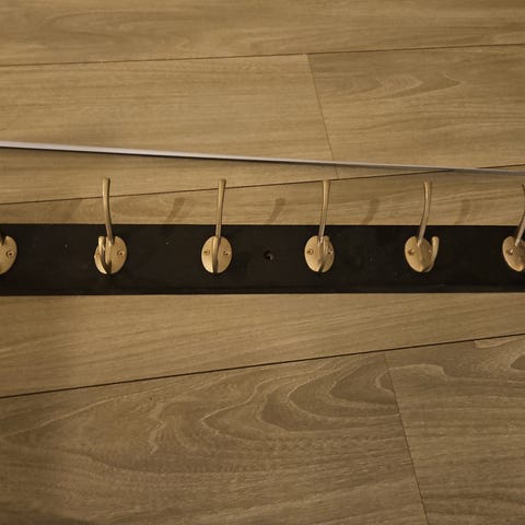 Produktbeskrivelse Praktisk knaggrekke med 6 doble kroker, perfekt for oppheng av klær og tilbehør. Den hvite laminatoverflaten gir et stilrent uttrykk som passer inn i ulike interiører. Spesifikasjoner Lengde: 1000 mm Høyde: 180 mm Dybde: 87 mm Farge: Hvit Materiale: Laminat Antall kroker: 6 Tilstand Utmerket tilstand uten synlige merker. Produktet er fullt funksjonelt og klart til bruk.