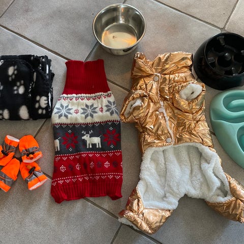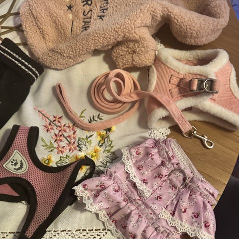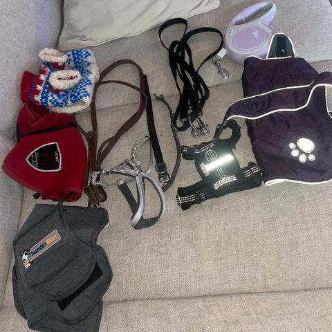 hundeutstyr sett med sele, jakke, leke, skjerf, og sløyfe. Utstyret passer små hunder (chihuahu, Yorkshire terrier)