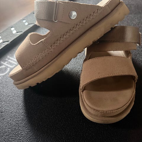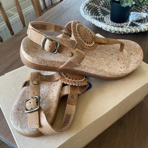 Sandalen har brun overdel med justerbare remmer og borrelåslukking. Sålen er lys og kraftig med mønster som gir godt grep. Modellen har åpen tå og hæl, og passer til bruk på varme dager og til hverdagsbruk.