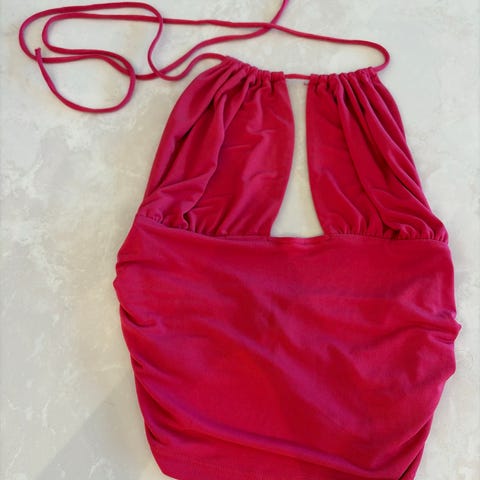 Even&Odd topp i størrelse S. Toppen er rød og laget i polyester, med en overflate som gir et lett skinnende uttrykk. Modellen har halterneck-løsning med knappelukking i nakken og er ermeløs. Passer som overdel til ulike antrekk der en kort og tettsittende topp ønskes.