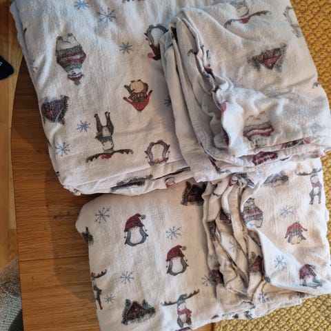 Lite brukt sengetrekk i str 140 x 200 cm. Grått på ene siden og hvitt på andre. Trykket tekst i kontrastfarge. 100 % bomull. Sendes mot porto.