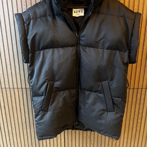 Naketano vest for dame i størrelse S. Vest i svart polyester med vattert utside og myk fôret innside. Modellen har høy krage, glidelås i front og glidelåslommer i siden. Egnet som ytterplagg på mildere dager eller som et ekstra isolerende lag under jakke.