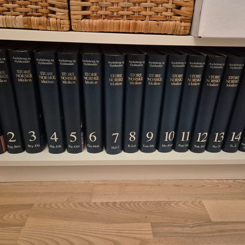 Store norske leksikon, bind 1til 14 med supplement fra 1992 og 1996.