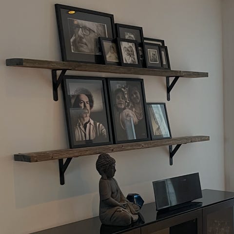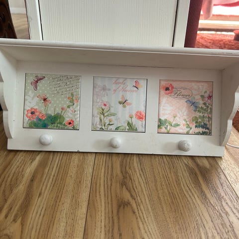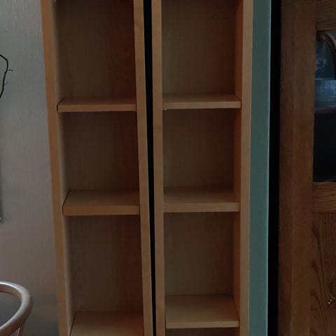 Einer seg til oppbevaring av småting. Det er 3 hyller. Den hylla som er enkel er 212 cm høy. Bredde 20 cm og dybde 17 cm