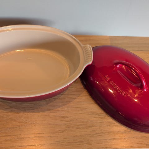 Le Creuset ildfast form i stentøy. Farge cerise. Størrelse 32x24cm. Egnet for bruk i ovn og til tilberedning av ulike retter. Tåler oppvaskmaskin. Kun brukt en gang, ellers veldig fin.