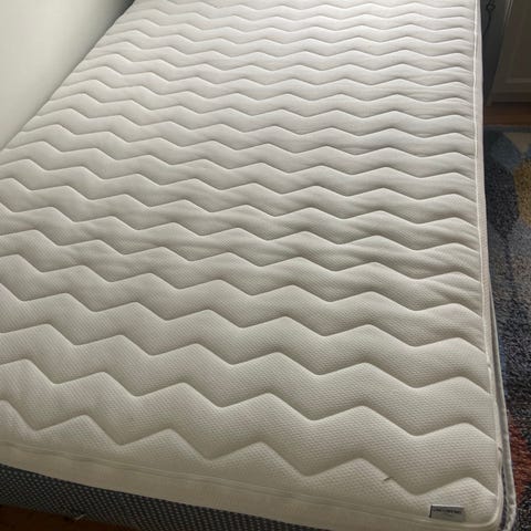 Seng 120 x 200 cm, pent brukt, med ubrukt Jysk Dreamzone overmadrass i hvit farge. Overmadrassen har et mønstret trekk og er merket med Greenfirst-etikett. Egnet som ekstra komfortlag på seng eller madrass i standard størrelse. Passer til bruk på soverom, gjesterom eller hybel der man ønsker et mykt og superkonfortabelt liggelag over hovedmadrassen.