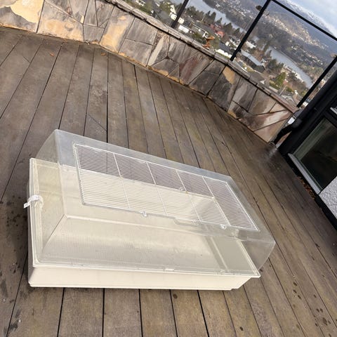 Smådyrbur i metall med tilhørende utegård i samme materiale. Buret har overdel i gitter og bunnkar i plast, samt en platting/etasje med rampe. Egnet for mindre kjæledyr som marsvin, avhengig av størrelse og behov. Fargen er brun med grå bunn. Buret kan brukes både inne og ute etter behov og tilrettelegging for dyrets trivsel og sikkerhet.