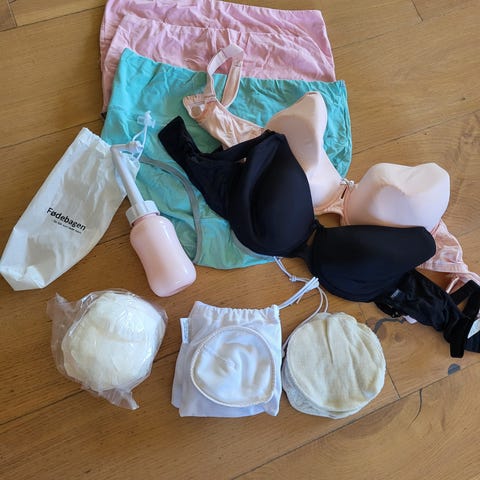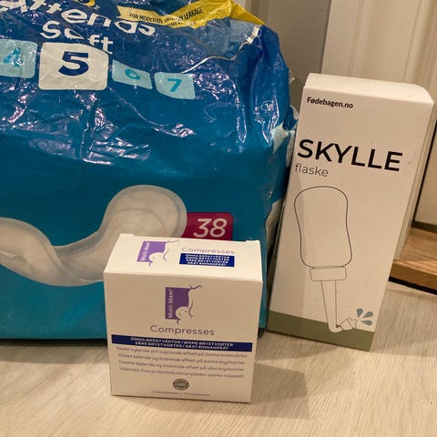 Seks kjølebind, ei skyllefkaske, lindre Wiese, compress og ammekopp frå medela. Aldri brukt.