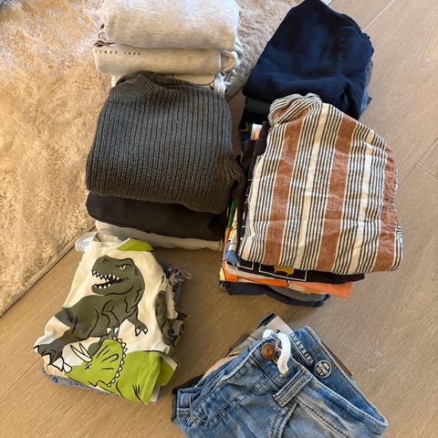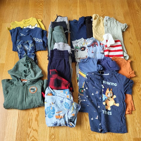Selger en pakke med klær i størrelsen 110-128. Omtrent halvparten av disse klærne har våre barnehage/skole klær. Det er også en del ubrukt eller lite brukt. Har sett over klærne og notert på selve bildene om jeg har funnet noe. Selges som det er , kom gjerne å se :D