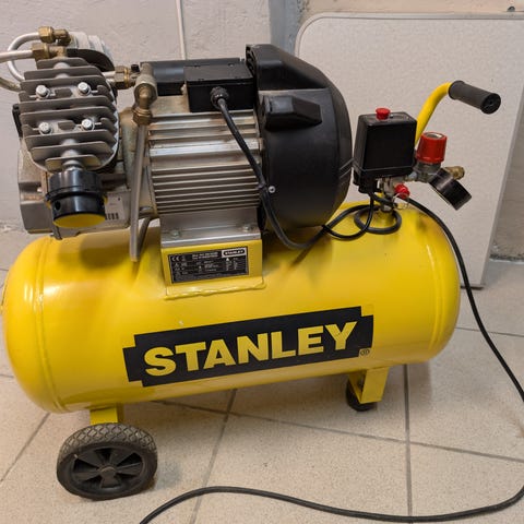 Nuair LT24 luftkompressor med 24 liters tank. Kompressoren er elektrisk drevet og har hjul og håndtak for enkel flytting. Lydnivået er oppgitt til 93 dB (LWA). Enheten har trykkmåler og tilkobling for trykkluftverktøy. Produsert i Italia og merket med nødvendige sikkerhets- og advarselsymboler. Egner seg til ulike trykkluftoppgaver i garasje, verksted eller hobbybruk der det er behov for en mobil kompressor med middels stor tank.
