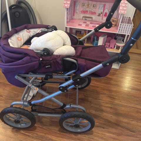 Baby dukkevogn i blå og hvit farge. Kjøpt i Spania. Vognen har fire hjul, justerbart håndtak og kalesje. Understellet har oppbevaringskurv, og det er fotbrett foran setet. Stoffdelene er i tekstil, og rammen er i hardplast og metall. Egnet som dukkevogn.