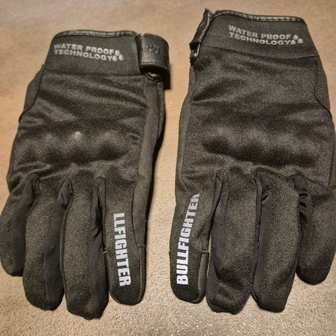 Difi Goreteks Ascot GT2 i størrelsen 9,5. Dette er motorsykkelhansker i skinn som er utstyrt med en GORE-TEX membran, noe som gjør dem både vanntette og pustende. De har borrelåsstramming rundt håndleddet for god passform.