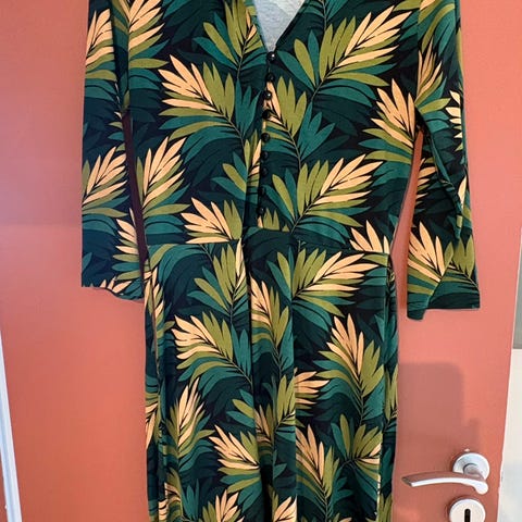 Nydelig kjole fra King Louie, str. L. Kan sendes mot porto. Knytebelte og ekstra knapp hører med. 95% viskose.
