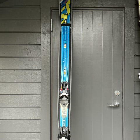 Elan GSX 166 Ace alpinski med bindinger i grønn og blå farge. Skiene har trekjernestruktur (Response Frame Woodcore) og Dual Ti-forsterkning med radius 17,5 m. Lengde på skiene er 166 cm. Leveres med monterte bindinger som vist på bildene.