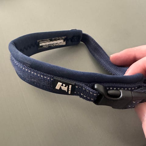 Kjøp på pets! Merke Trixie! Desverre aldri fått brukt da det ble litt for stort til tross for min staffe kraftkar! Dette halsbåndet er skikkelig tøft og kan kle jenter som gutter, men kreves en litt kraftig hals. Tykt behagelig lær, med flere innstilling og justeringsmuligjetet, meget solid, men allikevel mykt behagelig og bøyelig. Solid spenne og ring til å feste lenke eller bånd! Ønsker du at hunden din skal få litt bling i hverdagen å se skikkelig lekker ut på tur, så send meg en mld!