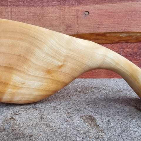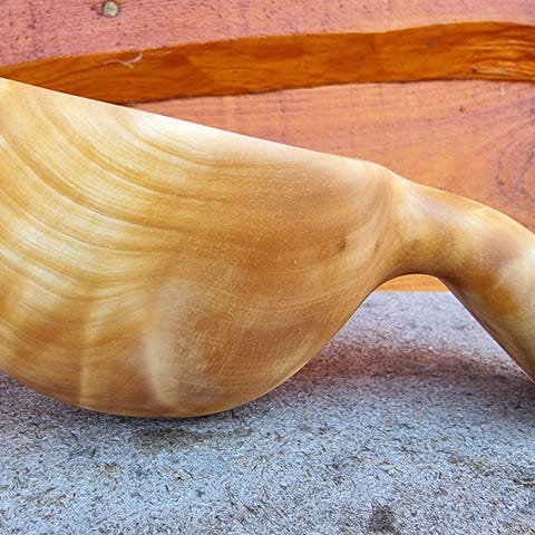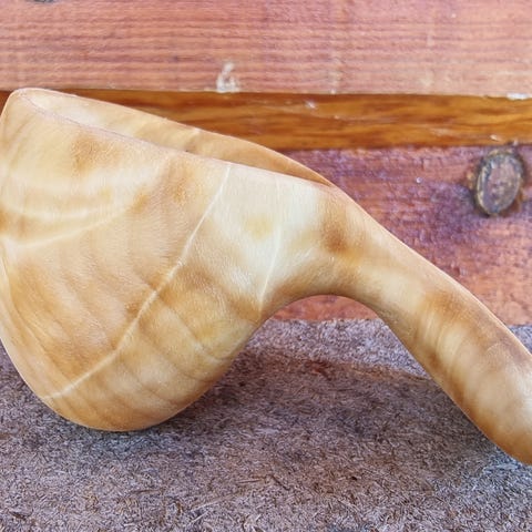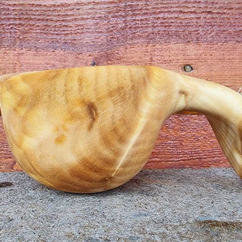 Alle koppemnene, som kommer fra riknuter på bjørk eller gråor, bli først kokt 1-2 timer. Dette for å unngå at de sprekker når man har varmt/kokende drikke i dem. Deretter grovformer jeg emnene, før jeg tørker dem i mikrobølgeovnen. De blir så formet og pusset til de har den ønskede formen. Tilslutt ligger de i rapsolje 3-4 døgn, før de legges på ei rist inntil de er helt tørr. Kan dessverre ikke bruke "FiksFerdig", da jeg i så fall må kjøre 10 mil. Sender med Posten, til kr 76,- for denne koppen. Denne koppen tar 2,6 dl helt full.