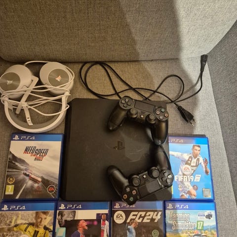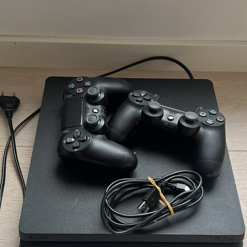 Sony PlayStation 4 (PS4) slim i svart. Leveres med tilhørende DualShock 4 kontroller (Uten gummi på joysticker) og strømledning. Kan også leveres med et spill inkludert (Se mine andre annonser).