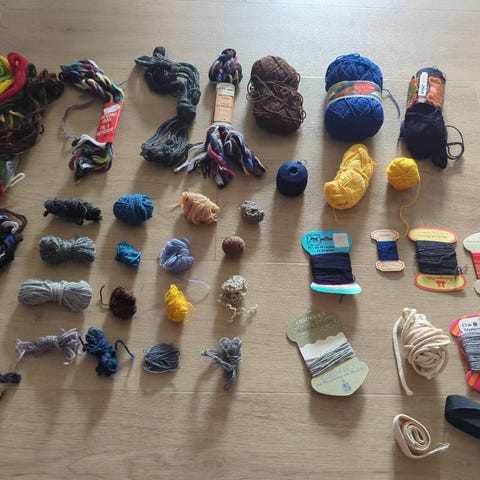 Garn, broderimønster, vattkuler, tråd, bånd, stoppesopp mm