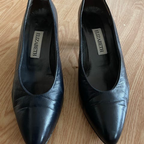 Nesten nye pensko i mørk blått semsket skinn og preget skinn. Både innvendig for og såle er av skinn . Ubetydelig brukt. Normal i størrelsen.