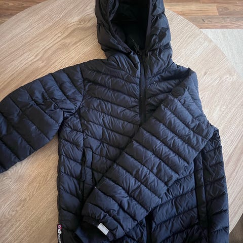 Skogstad tynn dunjakke str 140 selges for 150 kr. Stramming i livet, hette og lommer med glidelås. Super nå mor våren, alene eller under en skalljakke. Har sydd en søm under armen med en reperasjonslapp over. Foruten dette fremstår den pent brukt.