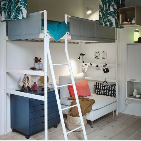IKEA loftseng i hvitmalt tre. Sengen har høy ramme med sengehest rundt hele liggeflaten og skrå stige med brede trinn for enkel adkomst. Under sengen er det god plass til for eksempel sofa, skrivebord eller oppbevaring. Leveres med ribbebunn i tre. Se skissen på bildet for omtrentlige ytre mål og høyde under sengen.
