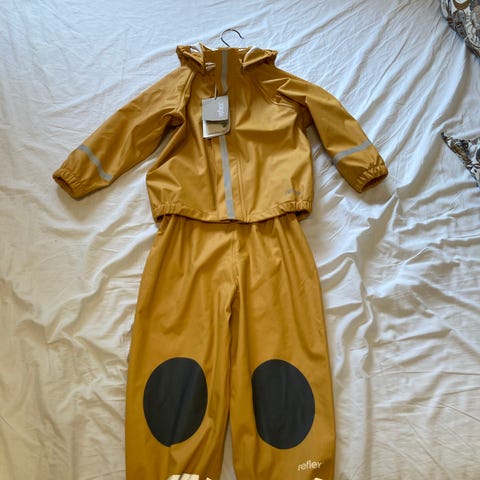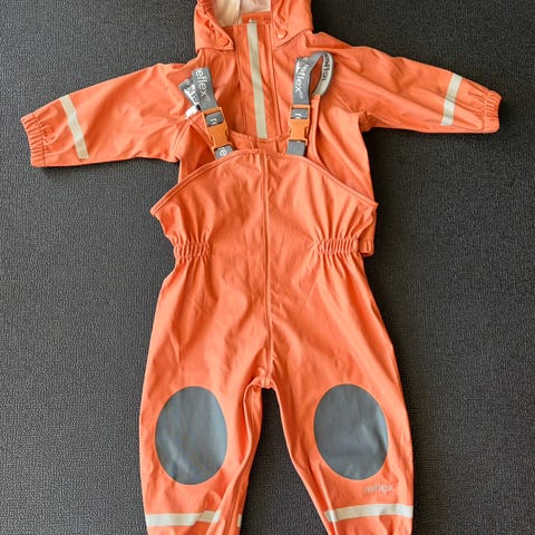 Reflex regnsett for barn, unisex, i størrelse 104. Sett med jakke og selebukse i oransje farge. Jakken har hette, glidelås foran og refleksdetaljer. Buksen har seler, forsterkede knær og strikk nederst i bena, samt refleksdetaljer. Egnet som yttertøy i vått vær for barn rundt 4 år.