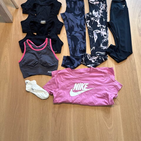 Sett med ulike treningsplagg for dame i størrelse XS. Bildene viser blant annet: