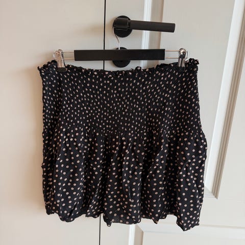 Ganni skjørt for dame i størrelse 40. Skjørtet er i blå polyester med plisséstruktur og diagonale striper. Lengden er maxi og harfremstår elastisk linning for komfortabel passform. Materialet er lett og faller mykt. Egnet til hverdagsbruk eller mer pyntede anledninger, og kan kombineres med både enkle topper og bluser.
