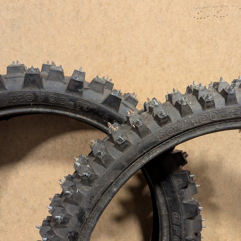 Vi kjøpte en cross sykkel som det stod is piggdekk på og siden vi skal bare kjøre på baner når det er sesong vil vi bare heller selge de.