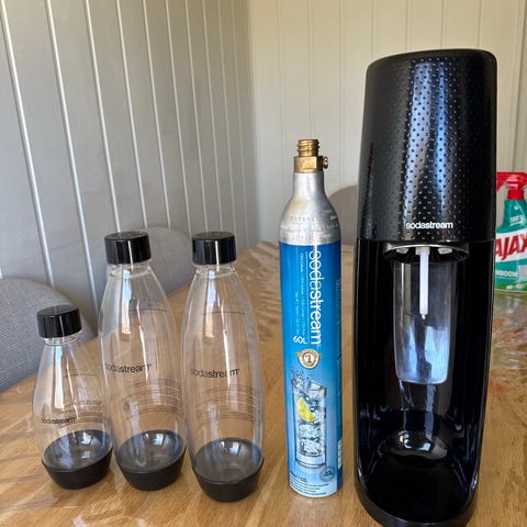 En pent brukt sodastream. Husker ikke når den er kjøpt, men er noen år siden. Ble litt brukt i starten når jeg fikk den, ellers har den stått pent i et skap. Følger med en patron i den men vet ikke hvor mye det er igjen i den og om den funker.