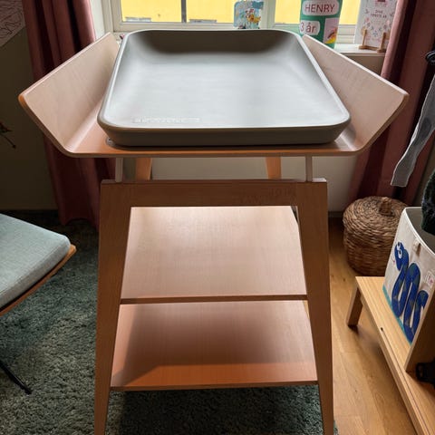 Leander stellebord i tre med topp i lys overflate kjøpt alene til ca 5000 kr . Stellebordet har en avtagbar stelleplate øverst med høye kanter. Under stelleflaten er det en uttrekkbar skuff i hvit utførelse, samt en åpen hylle nederst for oppbevaring av bleier, klær og annet utstyr. Bordet står på fire ben i tre og er konstruert for bruk på barnerom eller bad som funksjonelt stelleområde for baby. Det er egentlig skompute på toppen (besh og grått). Skuff og myk stellematte på toppen er kjøpt ekstra.