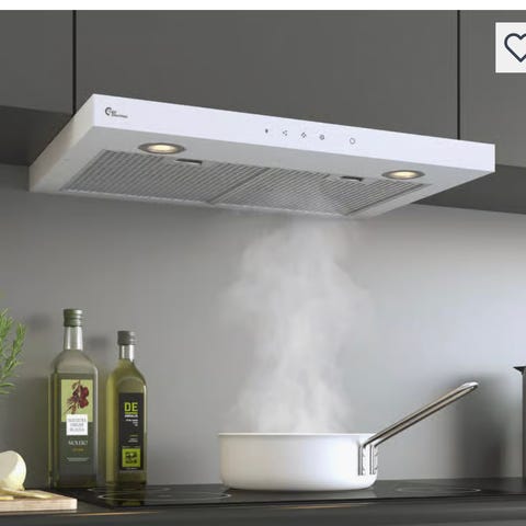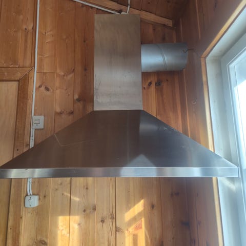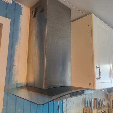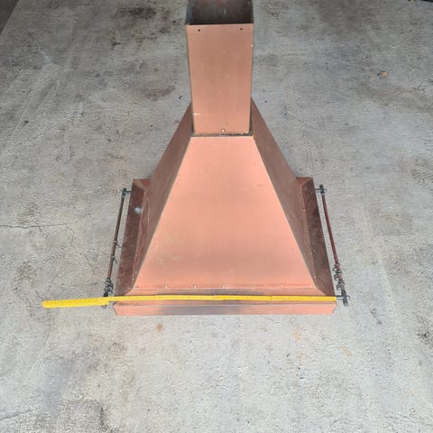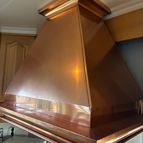 Kjøkkenventilator med frittstående hette i kobberutførelse. Hetteformen er klassisk pyramide med rette sider og synlige nagler langs nedre kant. Ventilatoren er beregnet for montering under tak, over komfyr eller koketopp. Undersiden har integrert vifte og fettfilter, samt betjeningspanel med brytere. Passer i kjøkken der man ønsker en synlig ventilatorhette i kobber. Nærmere tekniske spesifikasjoner som kapasitet og tilkobling er ukjent. B 90 cm, D 59 cm, H ca. 91 cm.