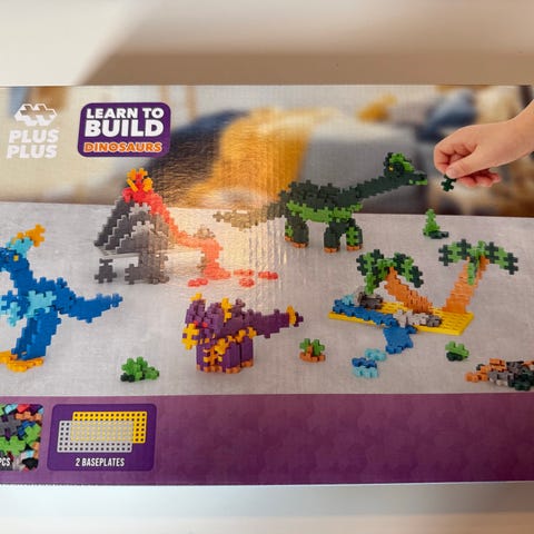 Plus Plus byggesett 3-i-1 mini består av små byggeklosser i plast som kan settes sammen til ulike figurer og modeller. Settene på bildene inkluderer blant annet en pakke med 480 mini neon-brikker i flere farger, samt et 3-i-1-sett i røde, hvite, svarte og grå nyanser. Brikkene kan brukes til å bygge de foreslåtte modellene på eskene eller egne konstruksjoner.