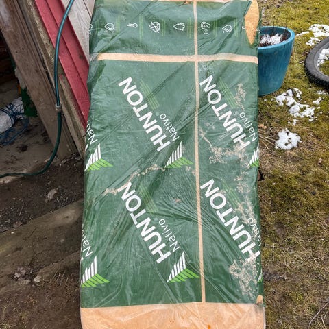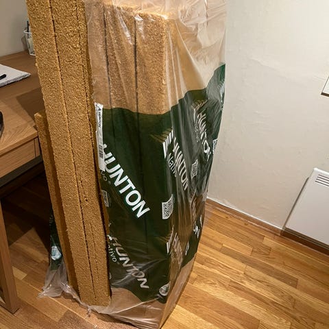 Hunton Nativo isolasjonsplater i trefiber i brunt, klare for bruk til isolering av konstruksjoner som vegger, tak , gulv. Tykkelse 150 mm. Selger 5 ubrukte plater for totalt 500,-.