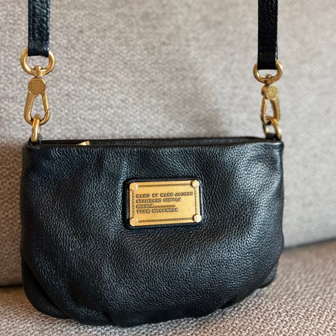 Marc Jacobs skinnpung for dame i svart lær. Liten veske/lommebok med glidelåslukking og metallring for feste. Gullfargede metall-detaljer og innvendig fôr. Passer til oppbevaring av nøkler, kort, småpenger eller andre småting i veske eller lomme. Brukt, men ikke slitasjemerker på skinnet.