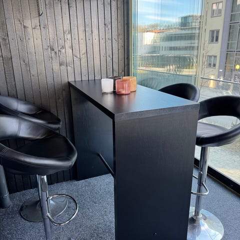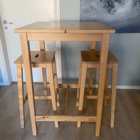 Bordet har diameter på 70 cm og høyde 110 cm. Høyde på stolene er 80 cm.