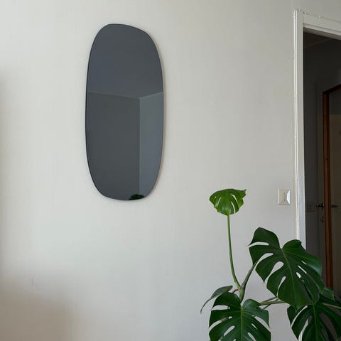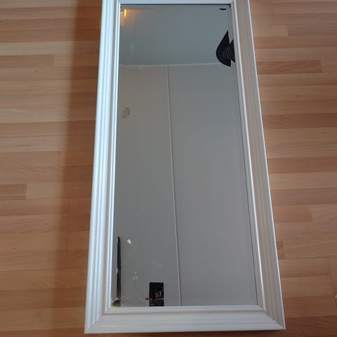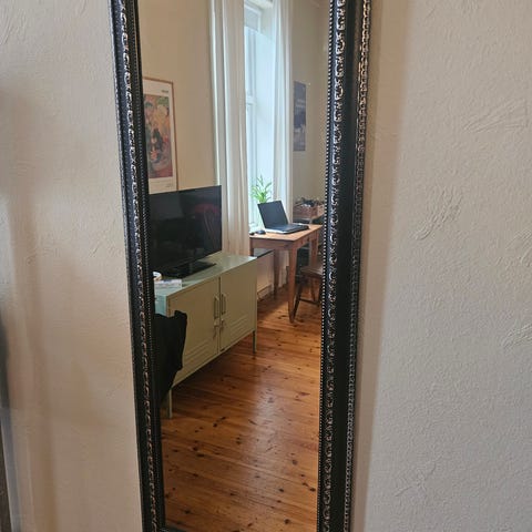 Selger tre solide og dekorative speil med en minimalistisk sort ramme. Speilene har en flott, avlang form som gir god romfølelse og et moderne uttrykk. De har tidligere vært brukt i [sett inn f.eks. restaurant/lokale], og fremstår som velholdte.