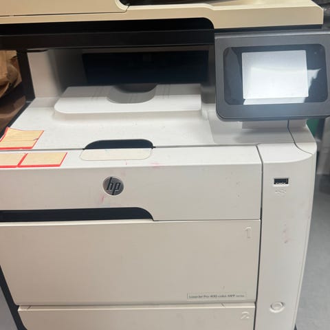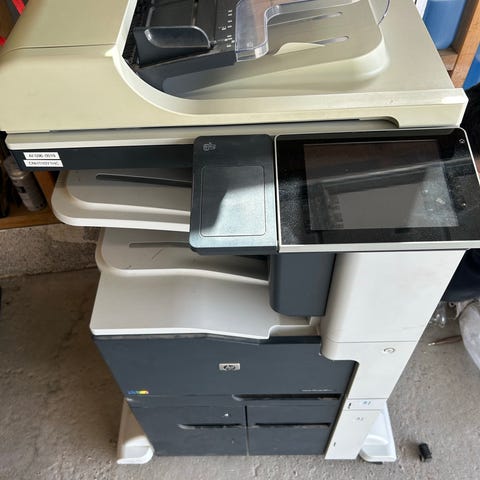 HP multifunksjonsskriver i grå og svart utførelse. Enheten har flatbed-skanner under toppdekselet og automatisk dokumentmater på toppen for enkel kopiering og skanning av flere sider. Skriveren har frontmatede papirskuffer og et kontrollpanel med display på siden. Egnet som kontorskriver til utskrift, skanning og kopiering av dokumenter i hjem eller mindre kontormiljøer.