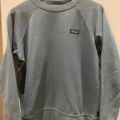 Patagonia Responsibili-Tee genser for dame i størrelse S. Genseren er grålig/turkis og laget av bomull. Den har rund hals og lange ermer. På brystet er det et lite Patagonia-logoavtrykk, og på ryggen et stort klassisk Patagonia-trykk med fjellmotiv. Passer til hverdagsbruk og fritid.