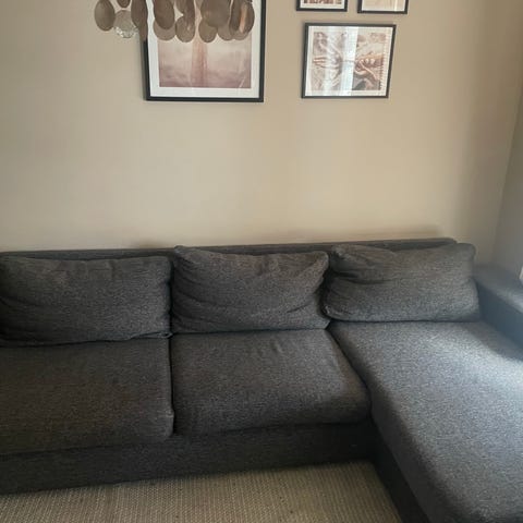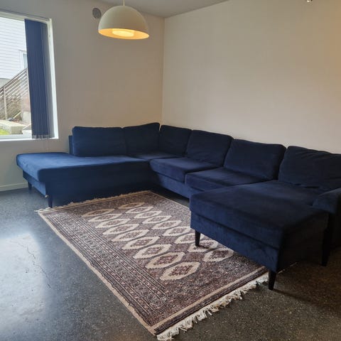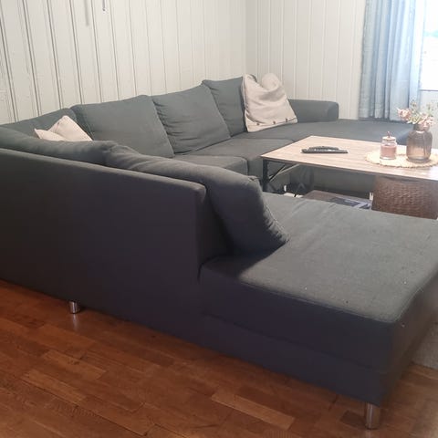 Vi kjøpte sofaen for et par år siden, så den er i god stand. Men den må skrues litt fra hverandre for å få satt trekket helt riktig på plass. (Trekket kom litt etter sofaen, så jeg skrudde den sammen litt for tidlig). Dette er en enkel sak. Stoffet er også vaskbart. Sofaen har en ekstra nakkestøtte som følger med.