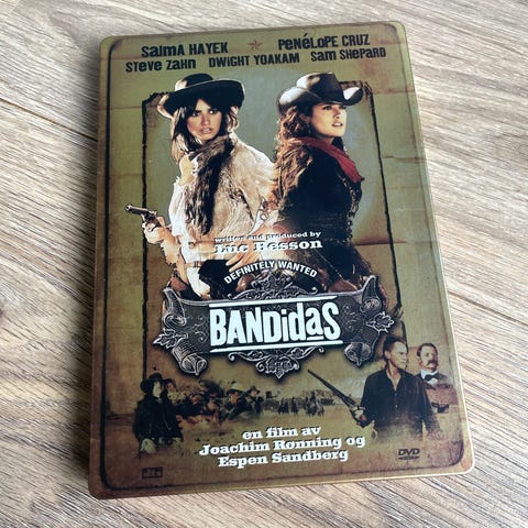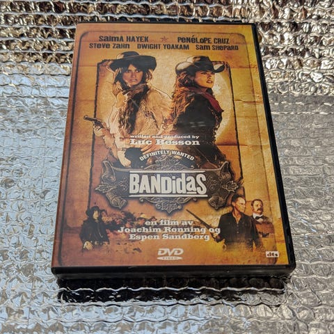 Bandidas DVD film. Omslaget viser westernfilm med to hovedpersoner. Formatet er DVD, egnet for avspilling på DVD-spiller som støtter standard DVD-plater. Passer for samlere av film på fysisk format eller for de som ønsker å se filmen på DVD.