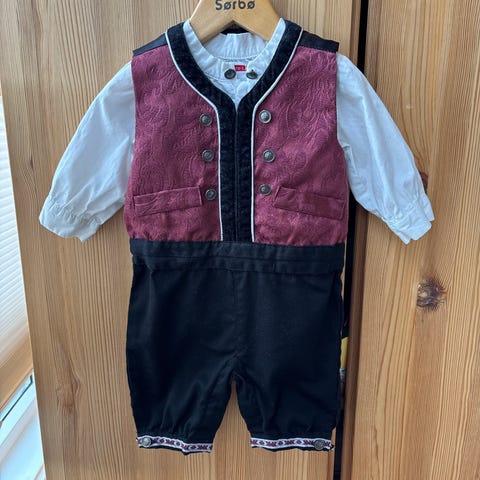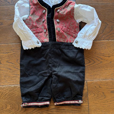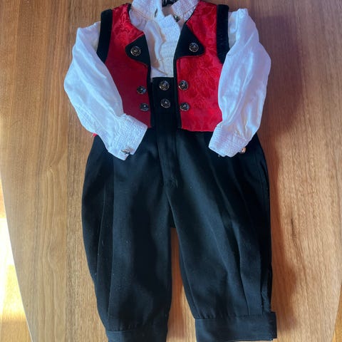 Selger nydelig festdrakt til barn i str 86 med bukse og sele, hvit skjorte, rød vest og sko i str 22