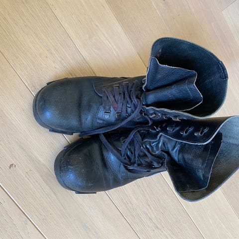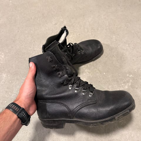 Militærstøvler i svart skinn, størrelse 41. Støvlene har snøring og solid gummisåle med mønster for godt grep. Egnet for utendørs bruk og robust aktivitet.