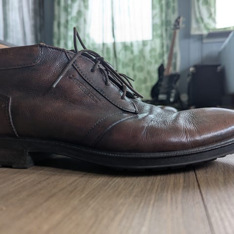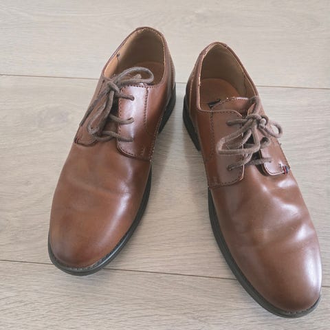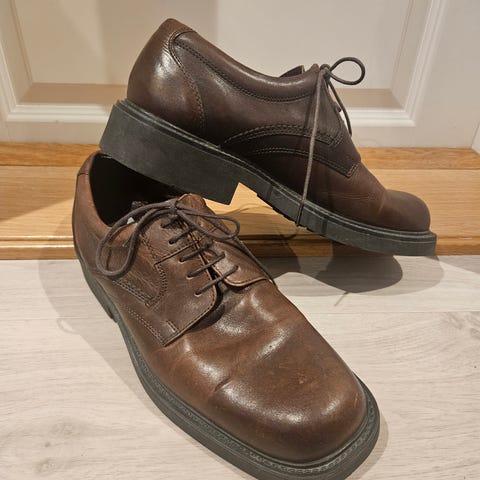 Velholdte Derby semiformelle sko i cognac brunt skinn. Normal slitasje bak på sålen. Få bruksmerker.