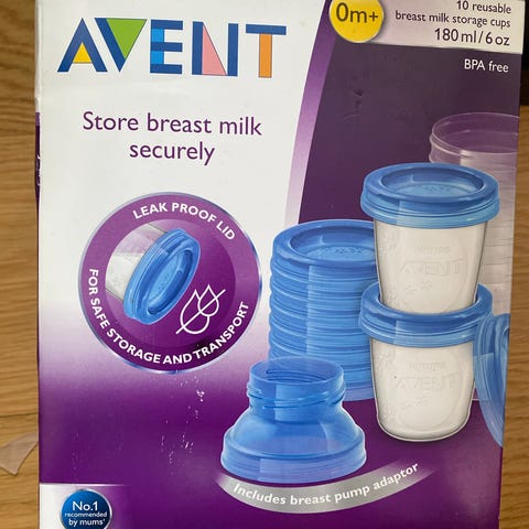 Philips Avent brystmelkoppholdere. Settet inneholder 10 beger med lokk og 2 adaptere. Hvert beger rommer 180 ml.
