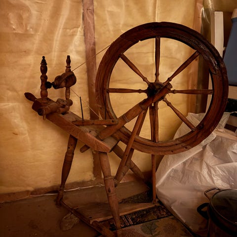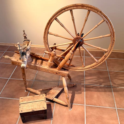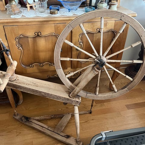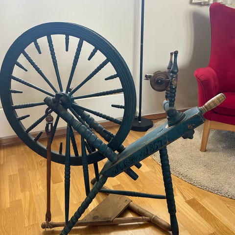 Spinnetein rokke i tre, brun farge. Tradisjonell hånddrevet rokke med stort hjul, fotbrett og spindel. Egner seg til spinning av garn og ull, samt som dekorativt innredningselement i hjem eller hytte. Laget hovedsakelig i tre med dreide detaljer og enkel mekanisk konstruksjon.