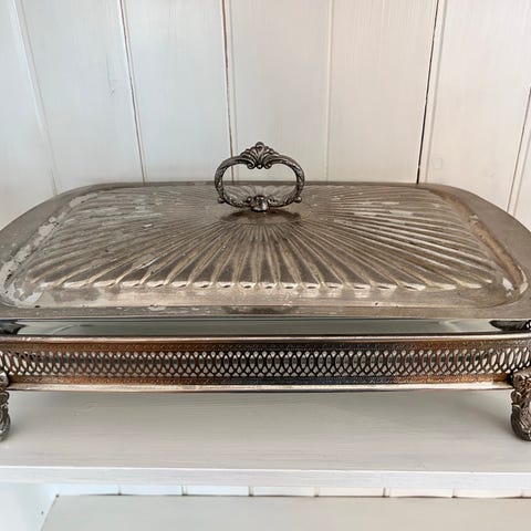 Elegant sølvfarge fat med en ildfast glassform i et.