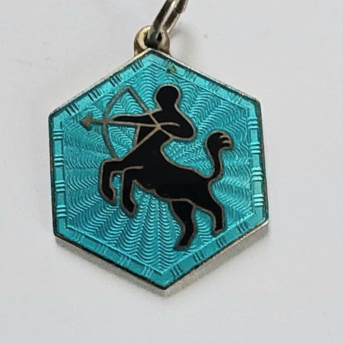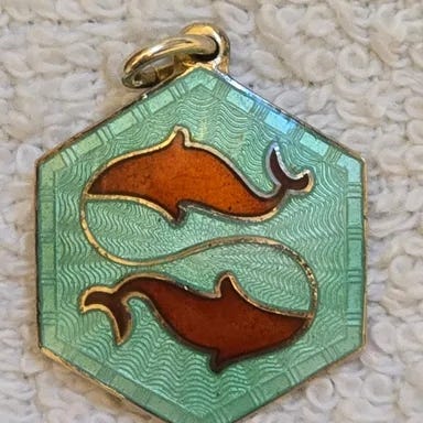 David-Andersen anheng i sølv med emalje, unisex. Anhenget er sekskantet med motiv av to fisker på forsiden, i oransje emalje mot lys turkis bakgrunn med bølgemønster. Baksiden er stemplet "David-Andersen Norway Sterling". Passer til bruk på kjede eller armbånd for både kvinner og menn.