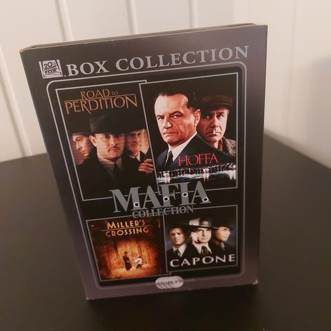 Mafia Collection DVD samleboks med fire filmer: Road to Perdition, Hoffa, Miller’s Crossing og Capone. Boksen inneholder spillefilmer med mafiatema samlet i én utgivelse.