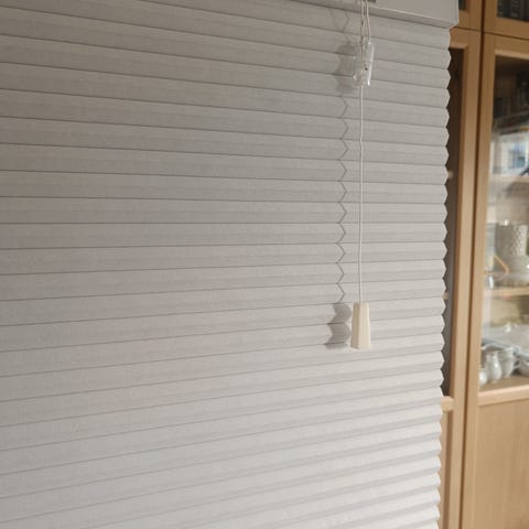 Kid plisségardin i hvit farge. Gardinen har horisontale plisseringer og snortrekk for justering av høyden. Passer til montering i vinduskarm eller på vegg der man ønsker skjerming for innsyn og lys. Materialet fremstår som lett og halvtransparent, egnet til bruk i stue, soverom eller andre oppholdsrom.
